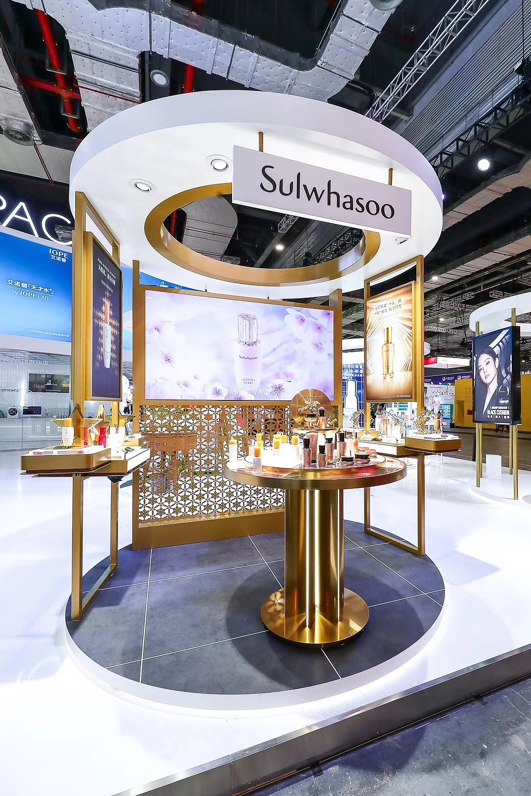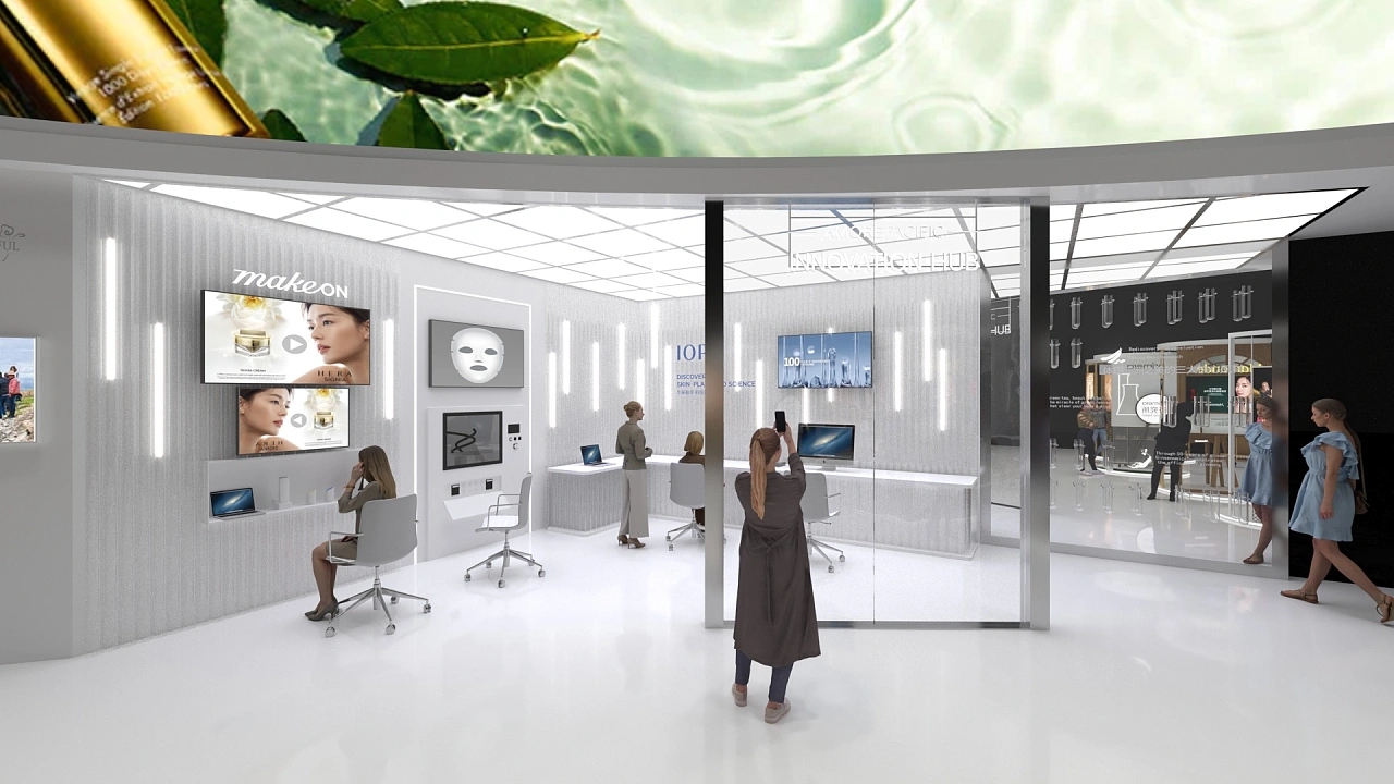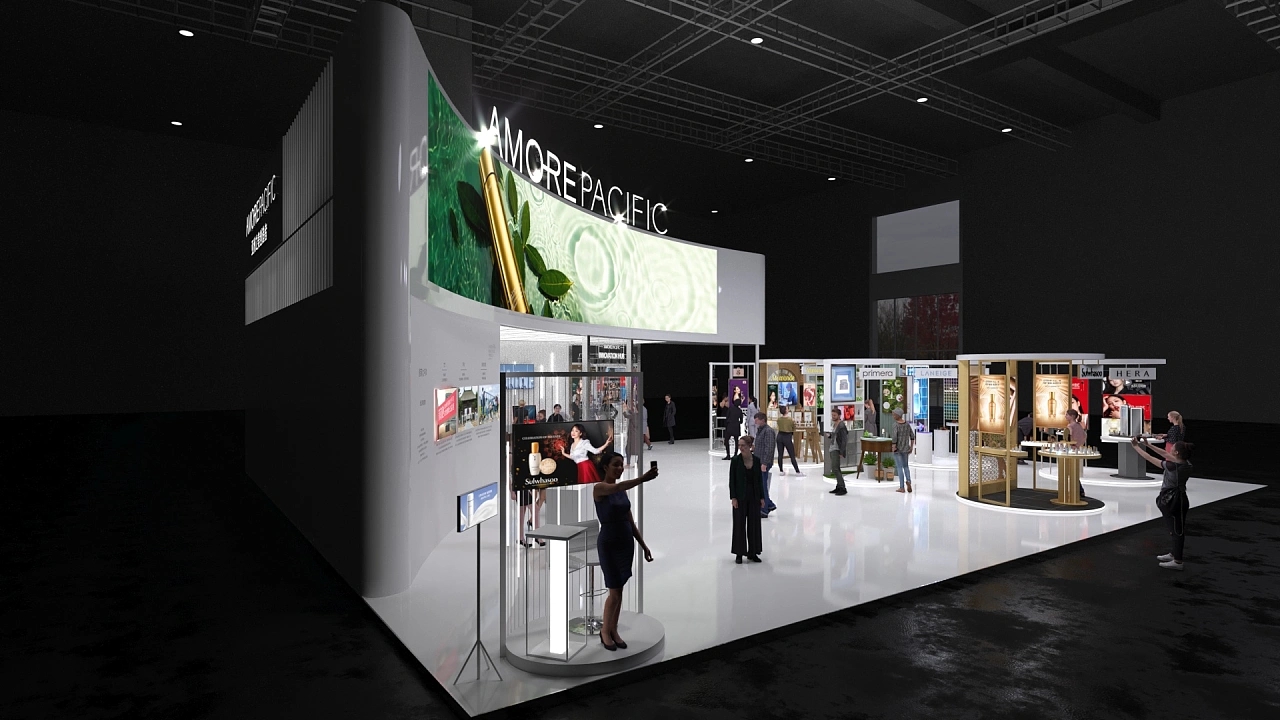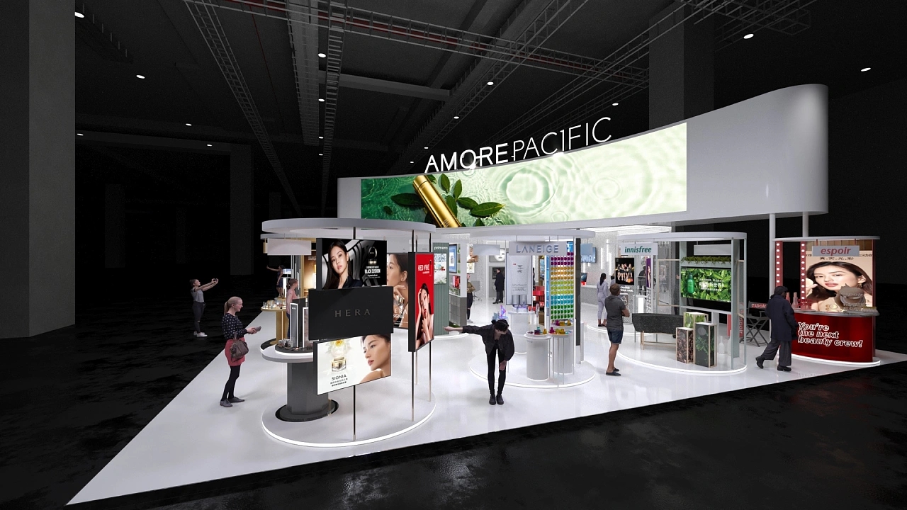 愛茉莉該展臺設計搭建面積共計270平,背面采用了特色的弧形墻面,上方布置了超大曲面屏,聚焦成為整個展館的焦點。在該展位設計中,根據企業的產品特性在展臺上布置了多個圓形展示臺,讓參展人群能更好的觀賞展示產品。展臺最內部還搭建了研發展示區,讓客戶能更清晰的了解到產品的研發與生產,提高展會參展客戶對產品的信任感。