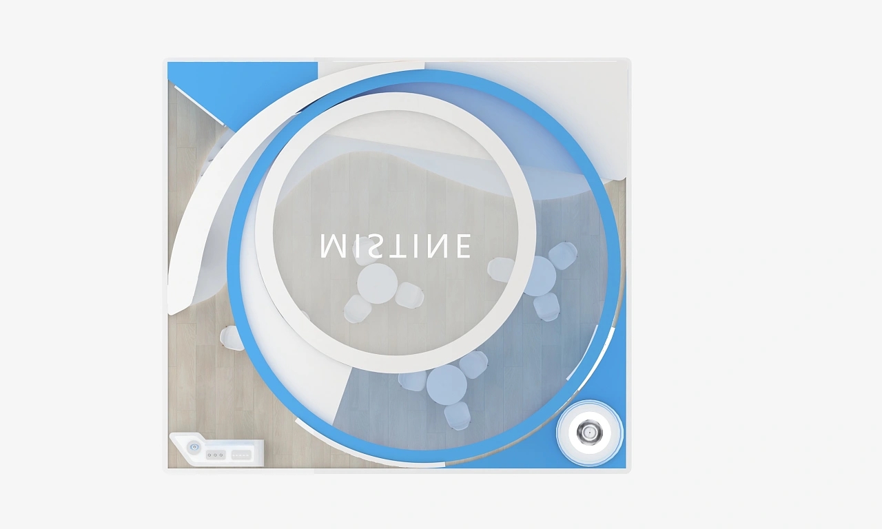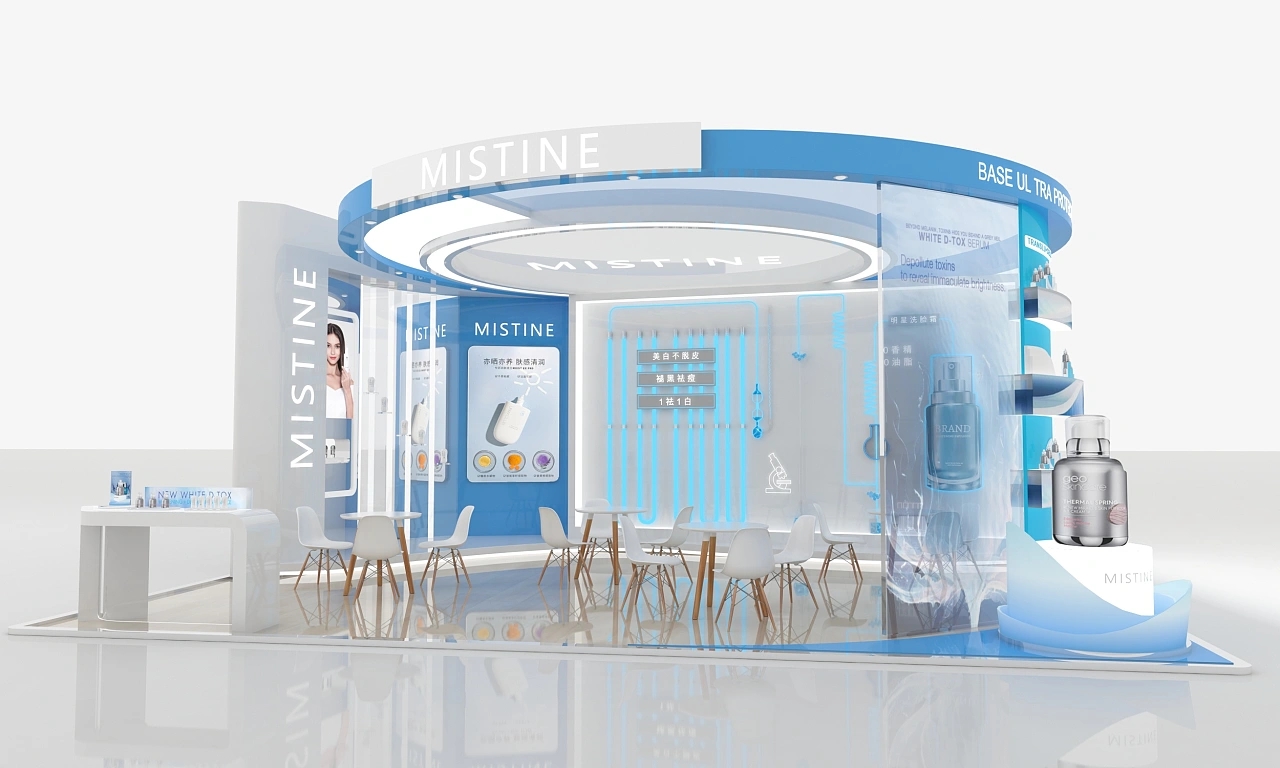 mistine該展臺設計面積為56平,顏色為藍白為主,整體造型是一個圓形的展臺。整個展臺搭建裝修上比較注重質感,地面鋪設了光滑的木地板,展臺氛圍十分清新自然、干凈明亮。展臺右側搭建了該企業中的重點產品的模型,能將參展觀眾的目光聚焦到該產品上。