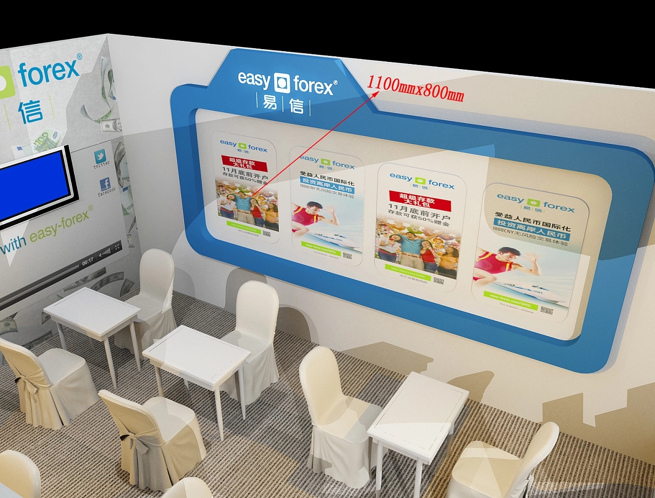 展臺設計搭建面積為56平方米,打造了一個特色的一面開的展臺,體現出該企業產品私密安全的性質。展臺內部墻面布置了110×80cm大小的海報墻,用于展示該產品的優勢與特色,整個展臺設計十分簡潔環保,有利于減少展臺布置搭建的成本。