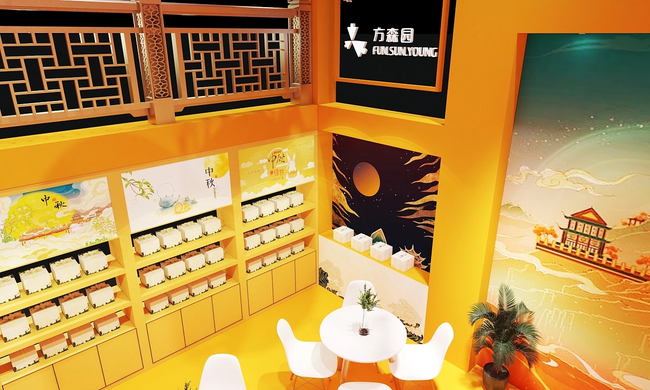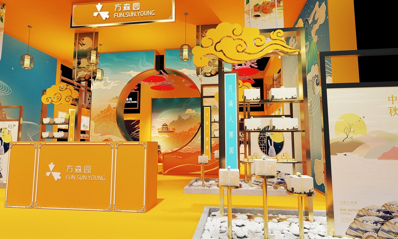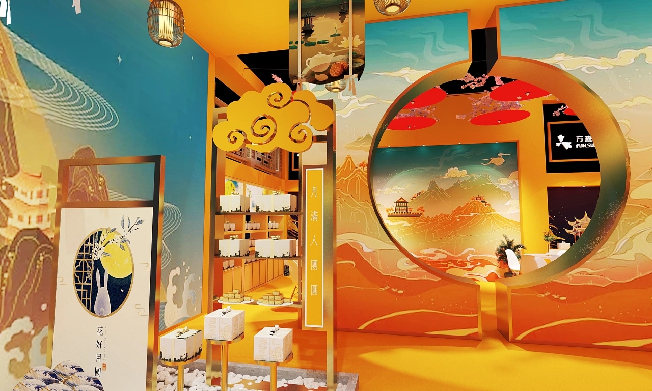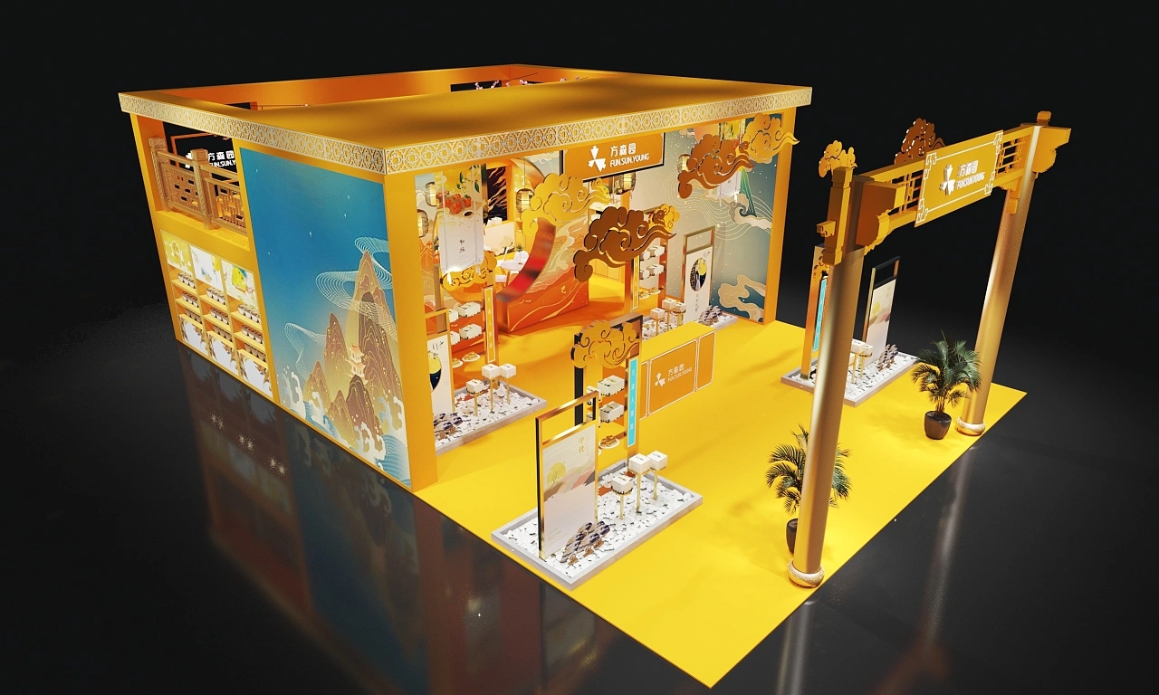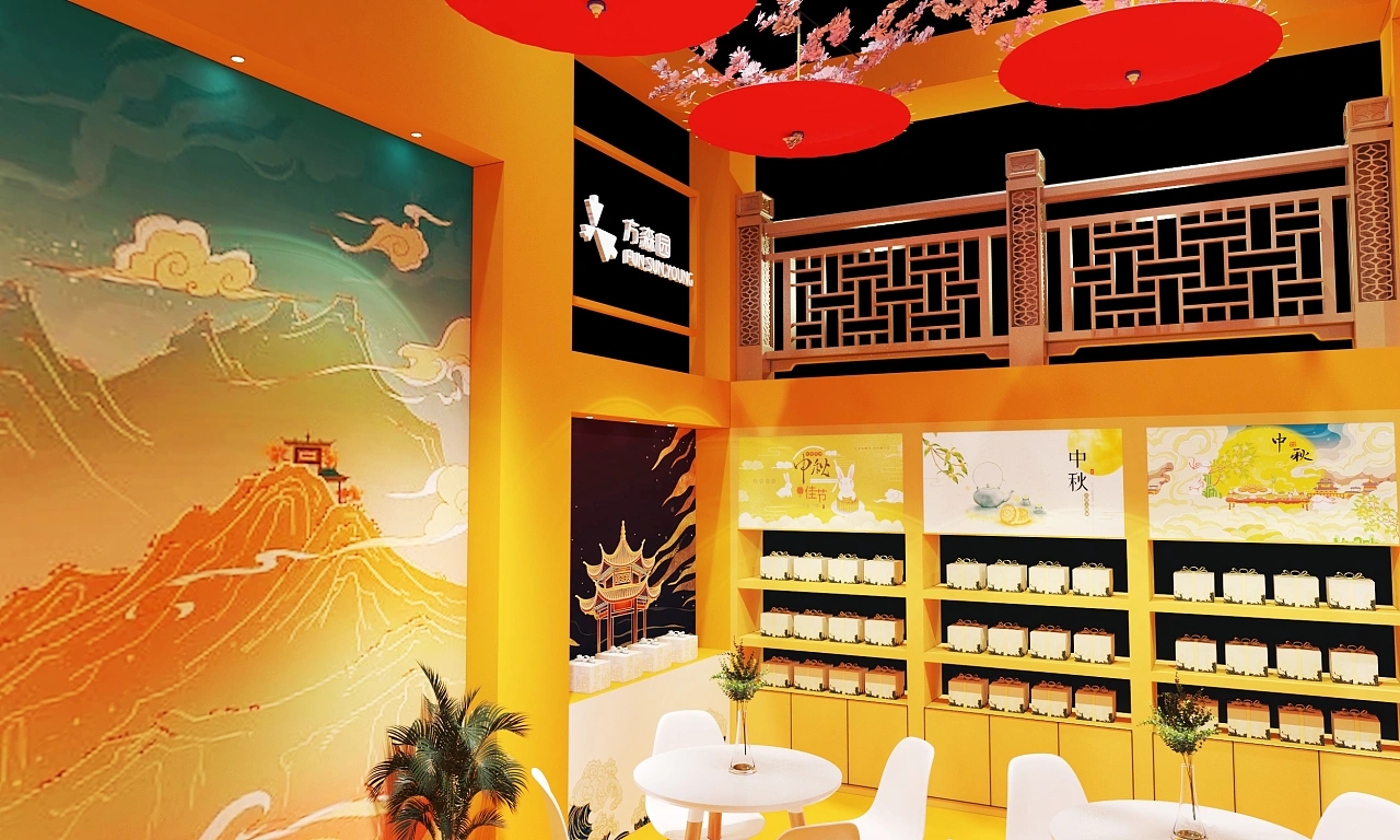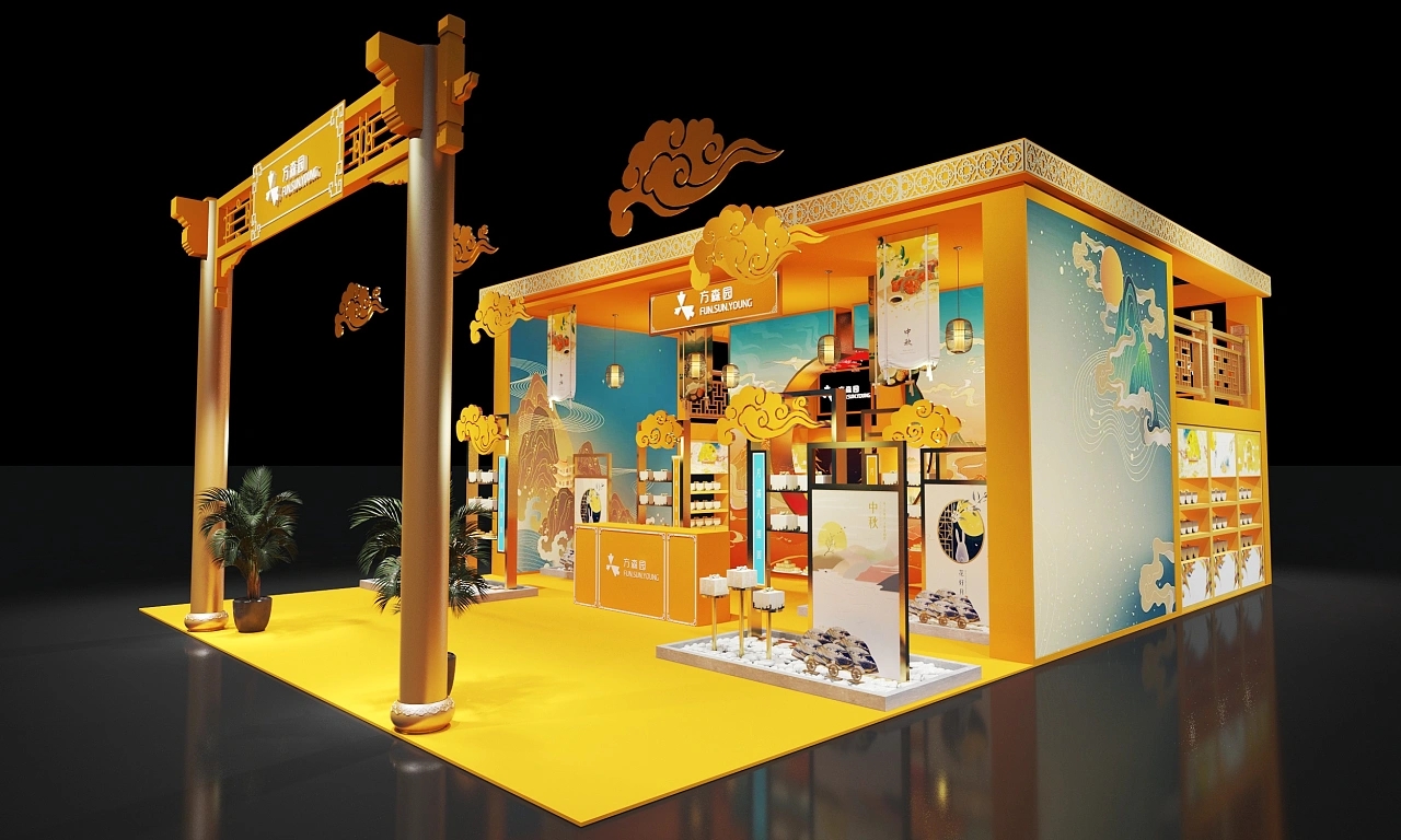 該展臺搭建面積為90平方米,整個展臺設計圍繞國風元素進行設計。該展臺結合了中秋的主題,在展臺設計搭建上采用金黃色作為主色調,展臺裝修設計了祥云、燈籠等傳統國風元素,整個展臺設計充滿金秋祥和如意、溫暖喜慶、高端大氣的展臺空間氛圍。